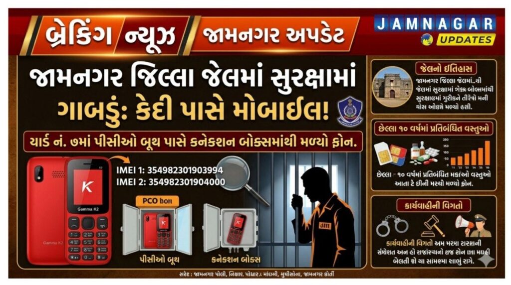 જામનગર અપડેટ્સ: જામનગરની હાઈ-સિક્યોરિટી ગણાતી જિલ્લા જેલ ફરી એકવાર વિવાદોના વમળમાં ફસાઈ છે. જેલની લોખંડી દીવાલો અને સીસીટીવીના પહેરા વચ્ચે પણ કેદીઓ સુધી પ્રતિબંધિત વસ્તુઓ પહોંચી રહી હોવાનો ચોંકાવનારો ખુલાસો થયો છે. જેલના યાર્ડ નંબર સાતમાં આવેલા પીસીઓ રૂમની પાછળ, ટેલિફોન બૂથના કનેક્શન બોક્સમાં છુપાવેલો એક મોબાઈલ ફોન મળી આવતા જેલ પ્રશાસનમાં દોડધામ મચી ગઈ છે. આ ઘટનાએ જેલની આંતરિક સુરક્ષા વ્યવસ્થા સામે અનેક સવાલો ઉભા કર્યા છે.