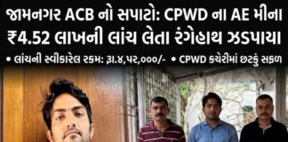 જામનગર: CPWD કચેરીના આસિસ્ટન્ટ એન્જિનિયર 4.52 લાખની લાંચ લેતા રંગેહાથ ઝડપાયા