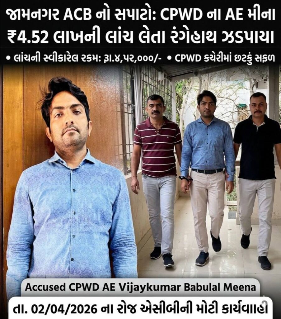જામનગર અપડેટ્સ: ભ્રષ્ટાચાર વિરોધી બ્યુરો (ACB) એ જામનગરમાં એક મોટું ઓપરેશન પાર પાડીને સેન્ટ્રલ પબ્લિક વર્ક ડિપાર્ટમેન્ટ (CPWD) ના વર્ગ-2 ના અધિકારીને લાખોની લાંચ લેતા દબોચી લીધા છે. આયુર્વેદ યુનિવર્સિટી કેમ્પસમાં આવેલી કચેરીમાં જ એસીબીએ છટકું ગોઠવીને મદદનીશ ઇજનેર વિજયકુમાર બાબુલાલ મીનાને ₹4,52,000 ની માતબર રકમ સ્વીકારતા ઝડપી પાડતા સરકારી બાબુઓમાં ફફડાટ ફેલાયો છે.