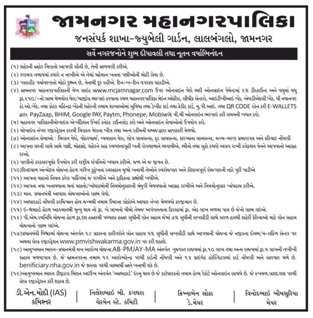 દિવાળીના પર્વ નિમિતે જામનગરમાં વિવિધ જગ્યાઓ પર રોશનીના તેમજ અવનવા શણગાર કરવામાં આવ્યા છે. ત્યારે સરકારી ઓફિસોમાં પણ રંગોળી તેમજ ફૂલોનો શણગાર અને સુશોભન કરવામાં આવ્યું છે. જામનગર જિલ્લા સેવા સદન ખાતે પણ મહિલા કર્મચારીઓ દ્વારા સુંદર રંગોળી તેમજ કલેકટર ઓફીસમાં ફૂલો અને દિવડાઓથી સુશોભન કરવામાં આવ્યું છે. જિલ્લા કલેકટર કેતન ઠક્કર અને જિલ્લા વિકાસ અધિકારી અંકિત પન્નુંએ બહેનોએ ફૂલોમાંથી બનાવેલી રંગોળી તેમજ સુશોભન નિહાળી તેમની કળાની પ્રસંશા કરી હતી. તથા કલેકટરએ જિલ્લા સમગ્ર ઓફિસ સ્ટાફ તેમજ સૌને દિવાળીના પર્વની શુભકામનાઓ પાઠવી હતી. અને સરકારના વોકલ ફોર લોકલના સૂત્રને સાર્થક કરવા માટે સ્થાનિક લોકો પાસેથી સ્વદેશી વસ્તુઓની ખરીદી કરવા અપીલ કરી હતી.