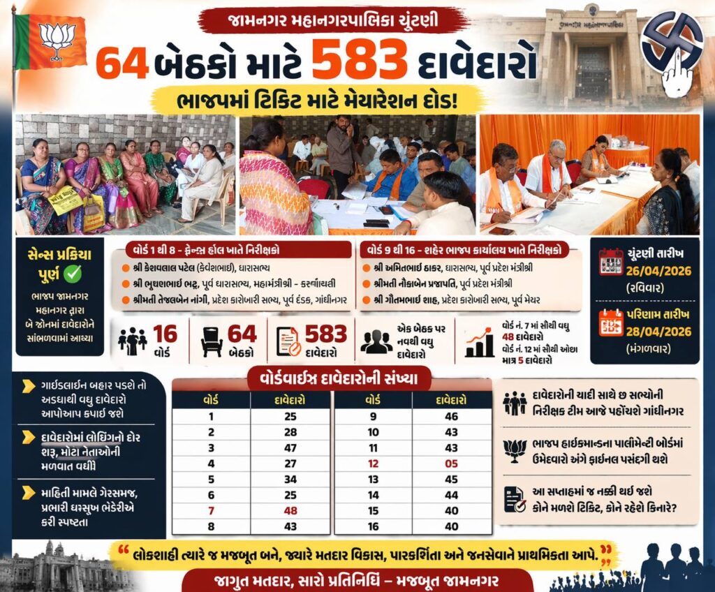 જામનગર અપડેટ્સ: આગામી ૨૬ તારીખે યોજાનારી જામનગર મહાનગરપાલિકાની ચૂંટણી પહેલાં ભારતીય જનતા પાર્ટીમાં ટિકિટ માટે ભારે ઉત્સાહ અને સ્પર્ધા જોવા મળી રહી છે. ૧૬ વોર્ડની ૬૪ બેઠકો માટે ભાજપે સેન્સ પ્રક્રિયા પૂર્ણ કરી છે, જેમાં કુલ ૫૮૩ દાવેદારોએ ટિકિટ માટે દાવેદારી નોંધાવી છે. દાવેદારોની આ ભારે સંખ્યા પાર્ટી માટે ઉમેદવારો પસંદ કરવાની પ્રક્રિયાને વધુ જટિલ બનાવી રહી છે.