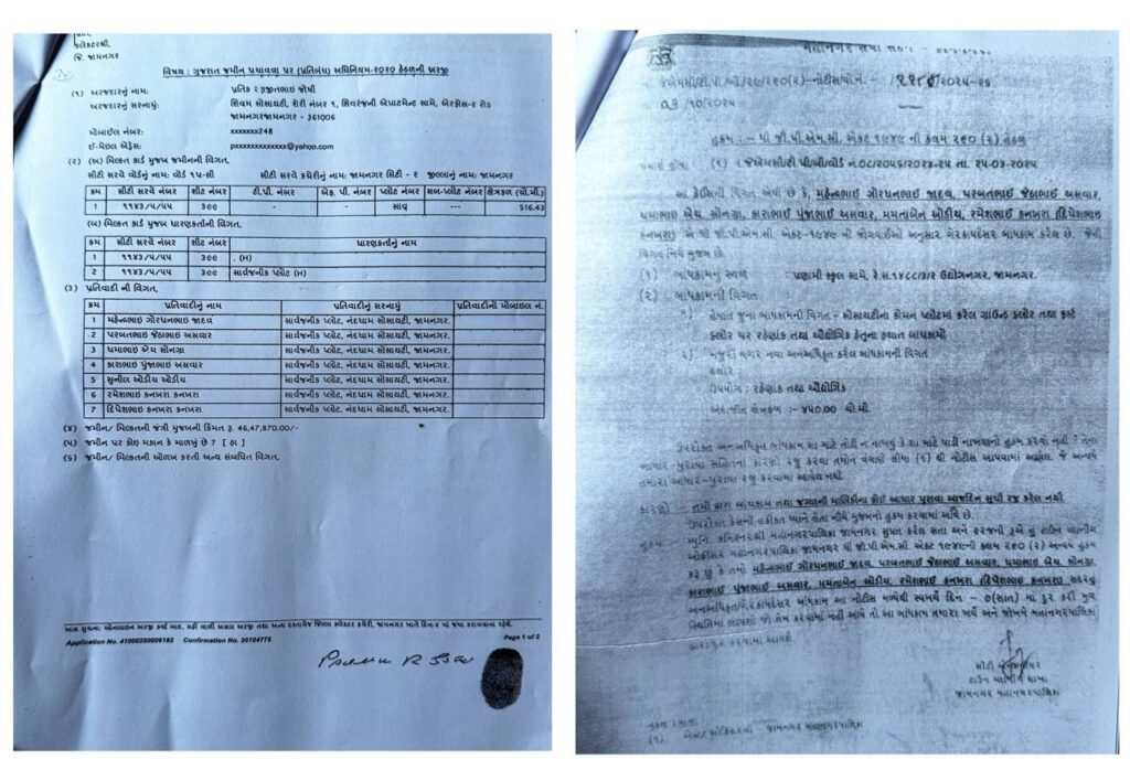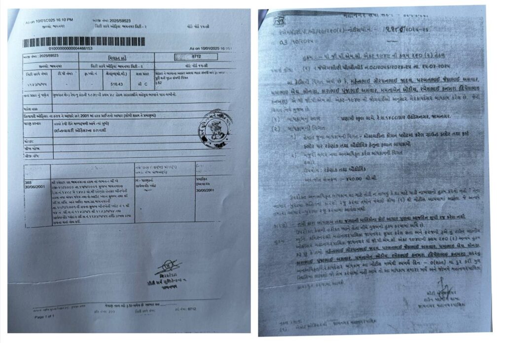 આ બાબતે વકીલ ધ્વારા રજુઆતો કરવાથી આ લેન્ડગ્રેબિંગ ફરીયાદ તળે તપાસ માટે સીટી સર્વે સુપ્રિન્ટેન્ડેન્ટ-૨ જામનગરની કચેરી ધ્વારા ફરીયાદી તથા આ દબાણ ધારકો ને આ અરજીના તપાસની કામગીરમા તારીખ : ૪-૦૯-૨૫ના ૫:૦૦ કલાકે જવાબ તથા આધાર પુરાવા સાથે હાજ થવા માટે નોટીસ આપવામાં આવેલ હતી. જે બાબતે ફરીયાદી તથા દબાણ ધારકો પોતે હાજ રહેલ અને દબાધ ધારકો ધ્વારા તેમના કોઈ માલીકી અંગેના કોઈ આધારો રજૂ કરેલ ન હતા પરંતુ તેમના ધ્વારા જામનગર મહાનગર પાલિકાના બીલો રજુ કરવામાં આવેલ તથા જે જોતા જાહેર થયેલ કે આ કોમન પ્લોટની જગ્યા છે. તે બીલમાં સ્પષ્ટ જણાવેલ છે. આ જગ્યા કોમન પ્લોટ છે. તેમ છતાં જામનગર મહાનગરપાલિ ધ્વારા ટેકના બીલ બનાવેલ તથા તેના વેરાના બીલો બનાવેલ છે. આ જાહેર થતા સ્પષ્ટ થાય છે. આ કોમન પ્લોટનુ દબાણ જામનગર મહાનગર પાલિકાના અધીકારી ઓ તથા સત્તા પક્ષના હાથ નીચે કામગીરી કરવામાં આવેલ છે. તેમજ આ ફરીયાદની તપાસની ધીમી ગીતીએ ચલાવી રહેલ છે જેથી આ દબાણ કરનારને પોતાના દબાણ માટે અન્ય કોઈ પણ રીતે આ ફરીયાદને અટકાવવાનો પ્રયત્ન કરી સકે. “આ તમામ માહિતી બહાર આવતા નંદધામ સોસાયટીના ધારકો ધ્વારા જામનગર મહાનગર પાલિકાના કમિશનર સાહેબ સમક્ષ રૂબરૂમા તારીખ : ૦૧-૧૦-૨૦૨૫ના રોજ આવેદન આપવામાં આવેલ છે. જેની સામે દબાણ કરના અસામાજીક વ્યકતીઓ ધ્વારા રજૂ કરવામ આવેલ કાગળો પુરાવામાં આપવામાં આવેલ હતા. જે પુરાવાઓ ધ્યાને લઇ જામનગર મહાનગર પાલિકાના કમિશ્નર સાહેબ ધ્વારા તારીખ : ૦૩/૧૦/૨૦૨૫ ના રોજ જેએમસી (ટી.પી.ઓબી. ૨૯/૨૬૦(૨)–નોટીસ/વો. નં. -/૧૧૮ ૮/૨૦૨૫ – ૨૬ થી ધી.જી.પી.એમ.સી. એકટ ૧૯૪૯ ની કલમ ૨૬૦ (૨) હેઠળ નોટીસ લગાવવામા આવેલ છે. જે મુજબ સ્પષ્ટ થાય છે. કે આ કોમન પ્લેટમા દબાણ છે. તેમ છતાં આરોપીઓને બચાવવા માટે લેન્ડગ્રેબિંગની જે કરીવાદને આગળ વધારવામા આવતી નથી અને આરોપીની અટક ન થાય તેમાટેના પ્રયત્નો થઈ રહેલ છે.